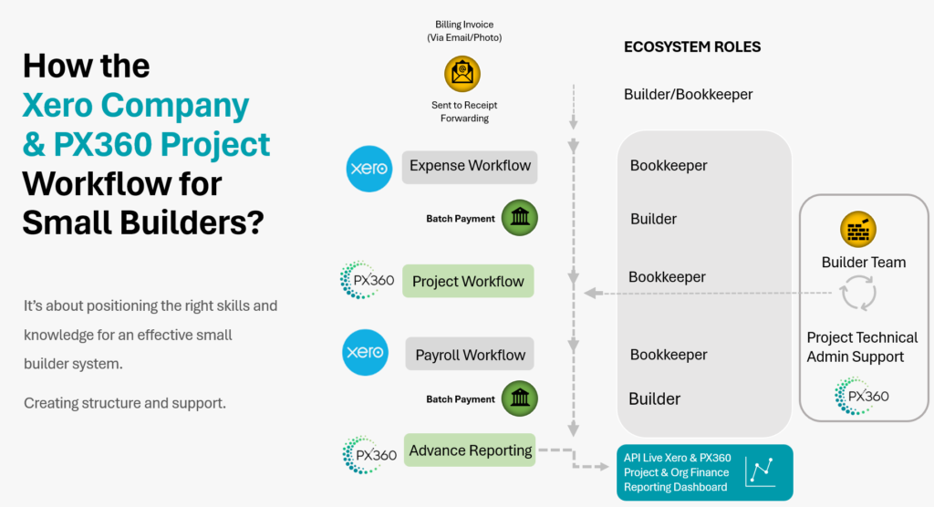 PX360 + Bookkeeper Upskilled with Project Services | Bookkeeper handles company finance, Project Budget Management and Labour Approvals. Builder manages all communications and contract administration | 2-4 Projects or 2 Large Projects. Streamline process great for growth | $1,400 – $2,500 Builder < workload